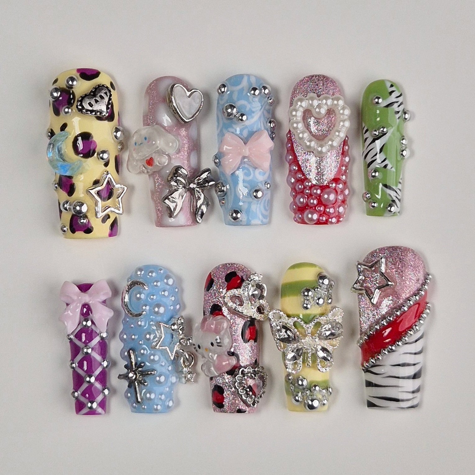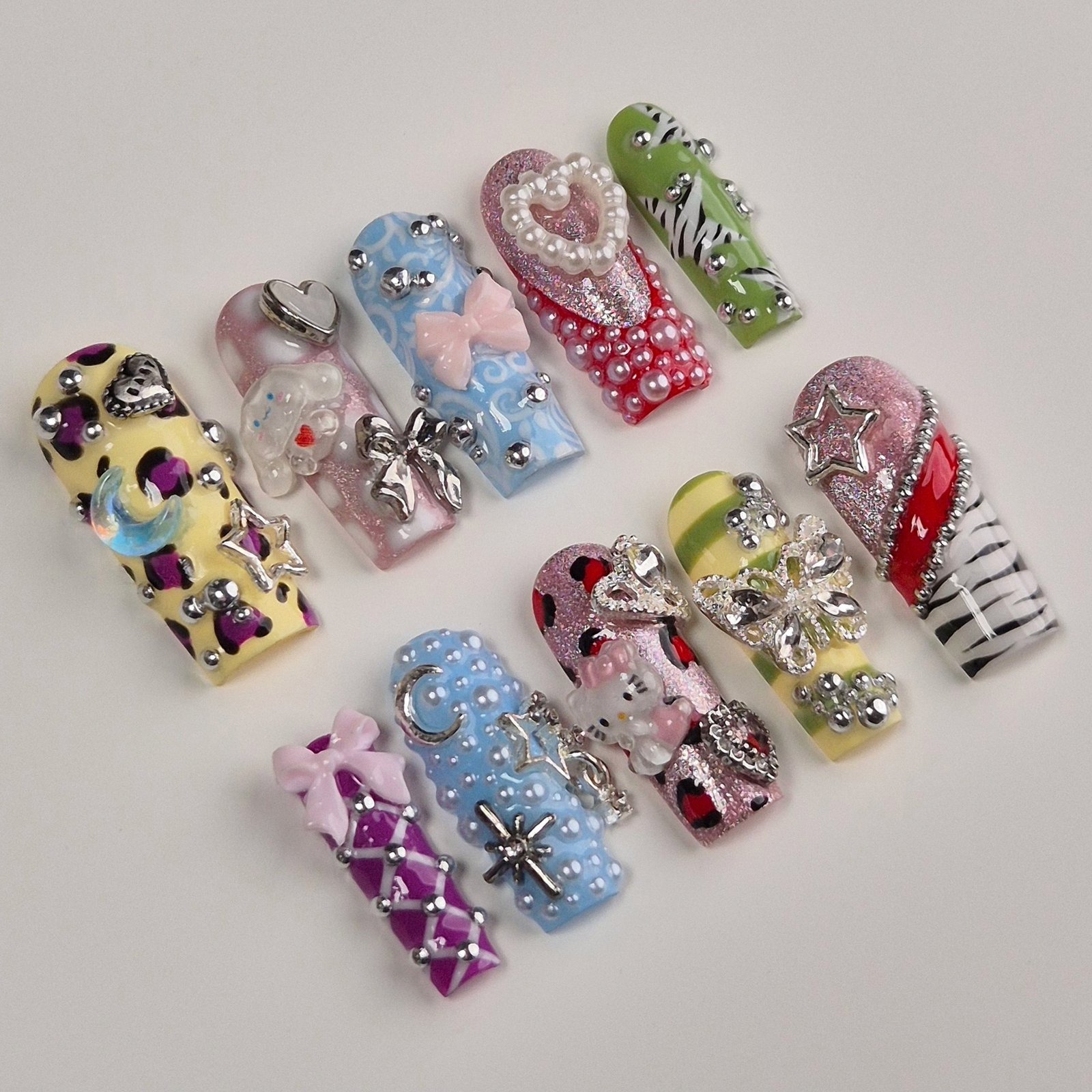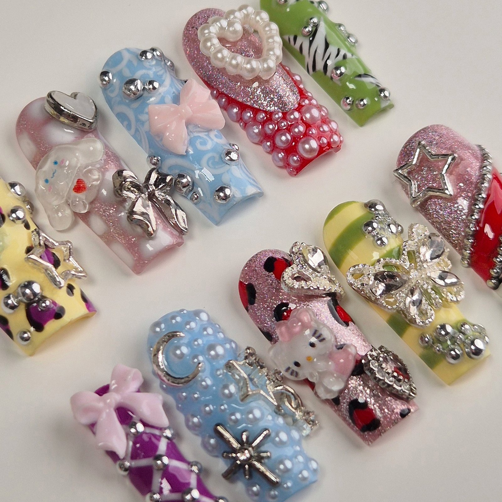 Chaque ongle joue avec des textures, des strass et des motifs uniques pour un style plein de personnalité et de créativité.